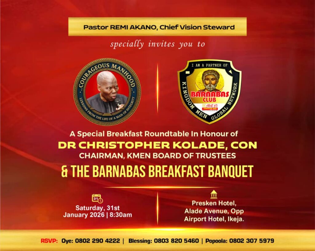 Speakers at the special edition of Men’s Breakfast Roundtable (MBR) which also doubles as KMEN Barnabas Breakfast Banquet (BBB), include Rev David Abraham, Managing Director, Managing Business for Christ (MBFC), a ministry founded by Dr Kolade; and Rev Paul Abiodun AkanbiOluwa, Executive Director, FEES Limited, who recently succeeded him as MBFC Board Chairman. Mr Gbolade Ighodia, a Business Strategist and Consultant and a Kolade acolyte is also on the panel.